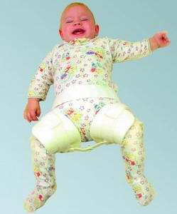 Валик Фрейка детский одевается непосредственно на тело, подгузник или на хлопчатобумажное белье. Противопоказания - местные заболевания кожи и неустраненные вывихи и подвывихи головки бедра.